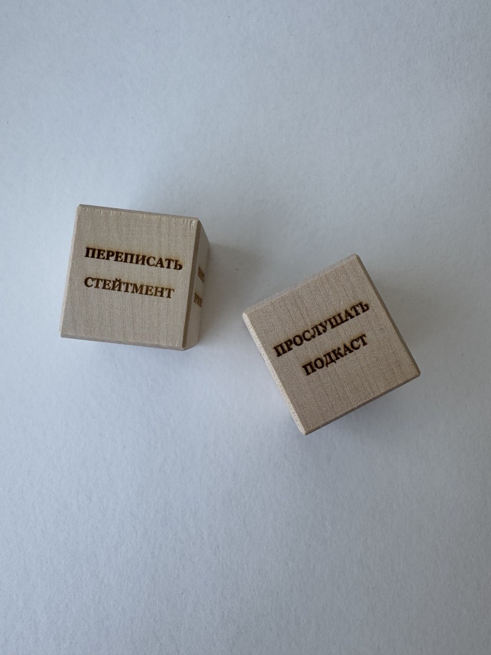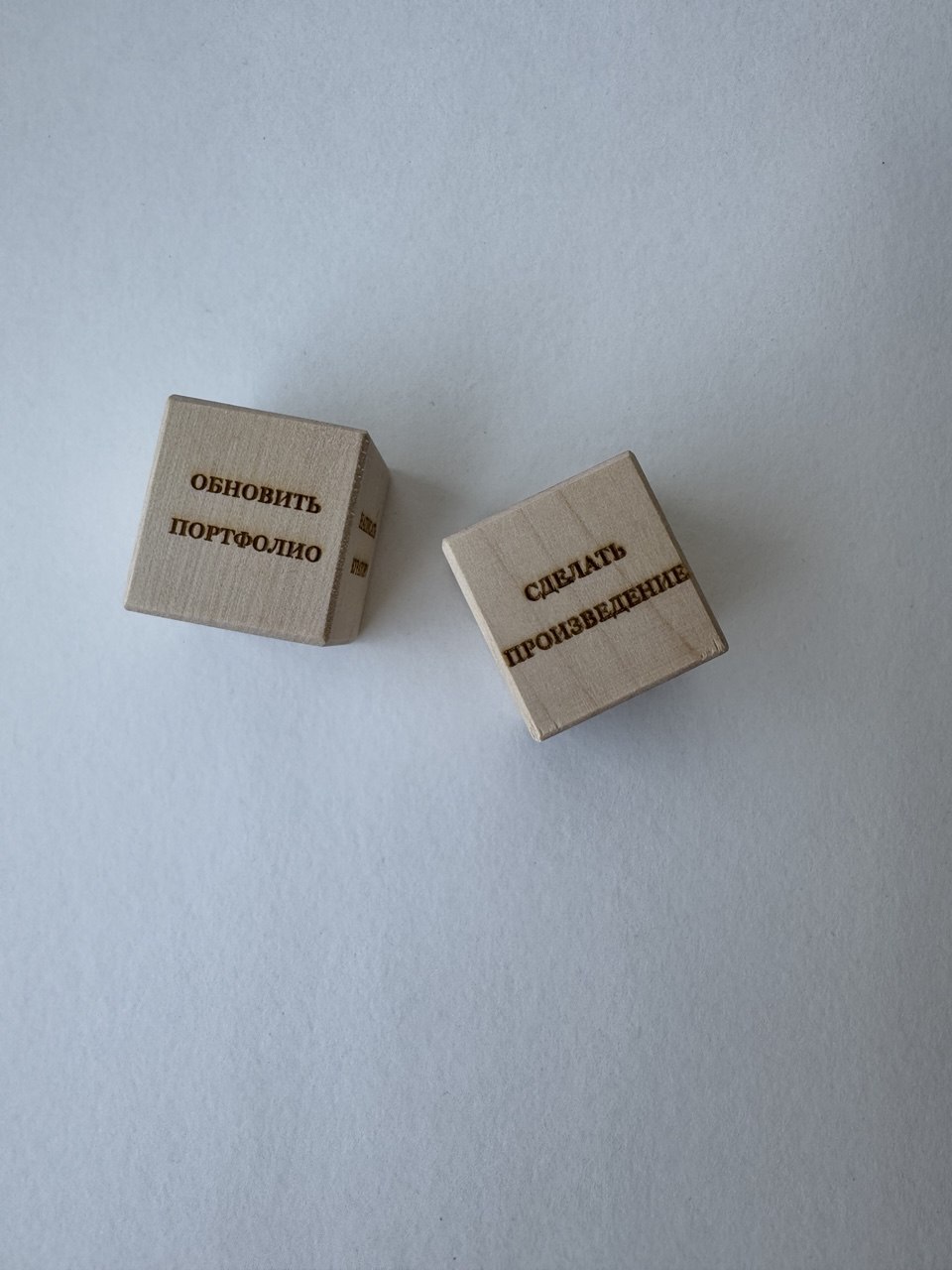 На кубиках записаны творческие задания, которые художник должен выполнять ежедневно. Например: «обновить портфолио», «посмотреть лекцию», «уточнить стейтмент» и так далее. Предлагаю поиграть: пусть художник каждый день бросает кубик и выполняет выпавшее задание.